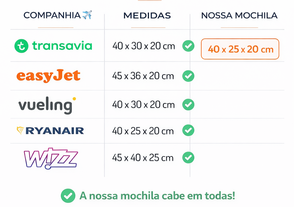 Mochila EatingMiles GO ( c/ medidas das companhias lowcost)