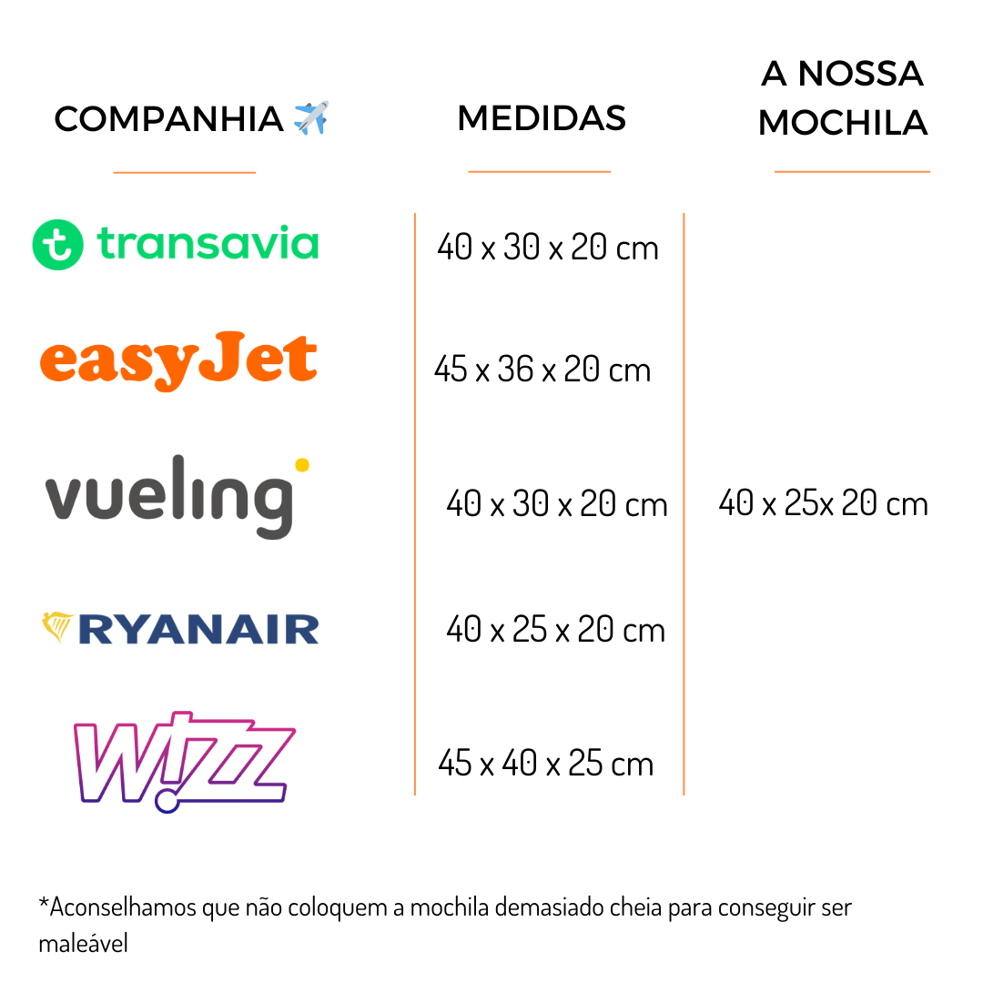 O tamanho da mochila é 40x25x20cm tamanho imposto pela Ryanair que e medida mais pequena das lowcost na Europa.